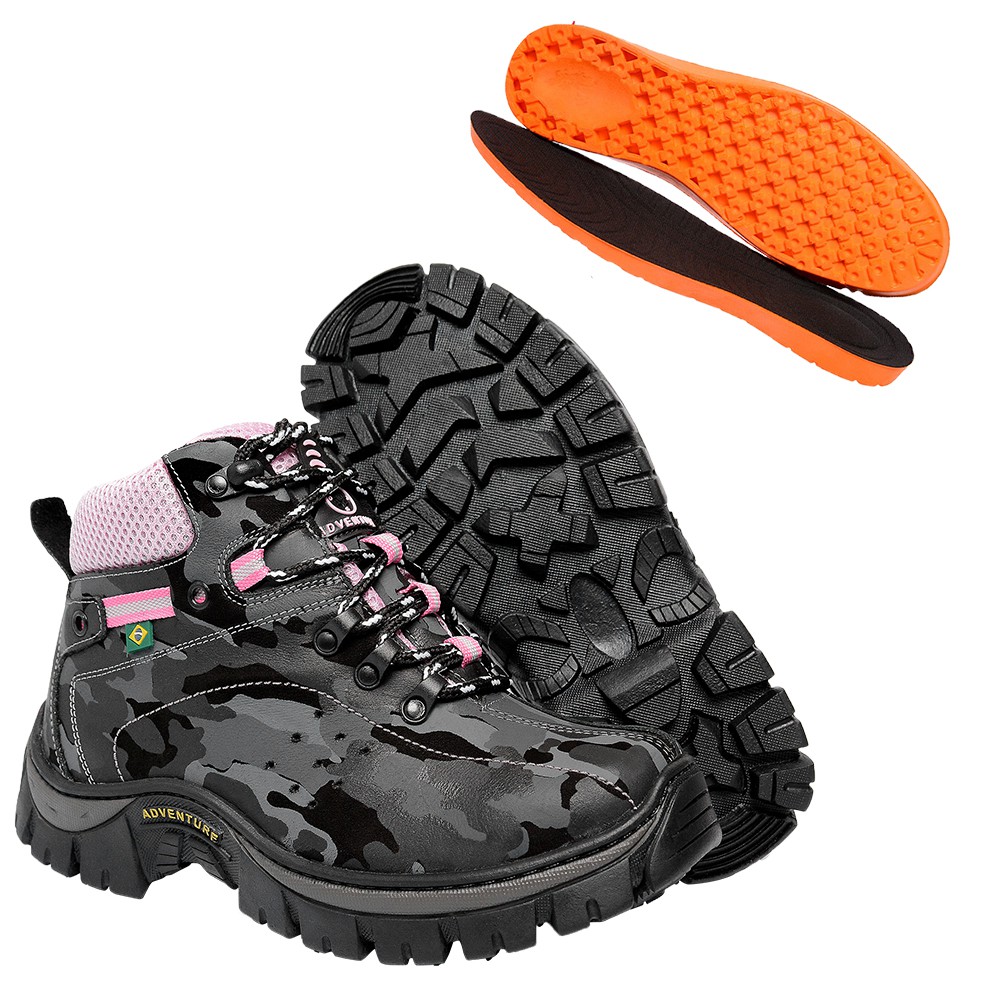 Bota Coturno Adventure Feminino Camuflado-Rosa em Couro Legítimo e Solado Costurado